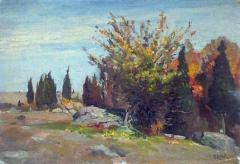 Landscape with Cedars, Lyme Oil on loose canvas CR.MJA.978