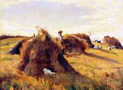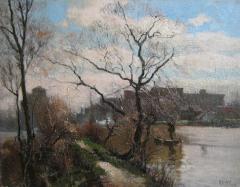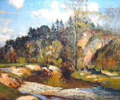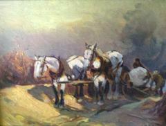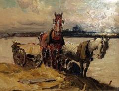 Horses, Farmers and Wagon by a Riverside